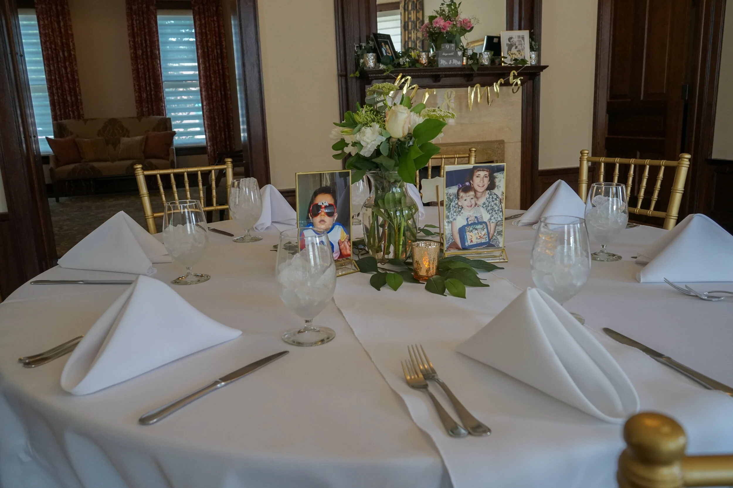Alright, now let’s get to decor! I love the look of simple greenery, so I wanted to incorporate that with gold and some pink for femininity. Pre-Covid, I had actually already bought a ton of picture frames and votive candles to be used at our rehearsal dinner, so I decided to put them to work for this event as well. Everything is so up in the air regarding what we will get to experience, so I figured I might as well use them now in case they don’t get to make an appearance later! I ordered these frames on Amazon for cocktail tables, intending to put pictures of J and I in them. Once I went to his parent’s house to gather childhood photos for our slideshow, I decided that baby pictures of us would be better and give guests a good laugh. I had also purchased these gold votives for cocktail tables, so I decided to use them on the dining tables as well. My mom and I went to Michael’s and found a bunch of simple greenery that we used to scatter on the tables. Then, in the center of it all, we put a floral arrangement on each table. I didn’t want to go crazy on flowers, seeing as how they really just die, so we went to Costco and Trader Joe’s the morning before and bought a TON of flowers. I’m talking we CLEANED THEM OUT. Thanks to many years of J being a romantic, I had a ton of extra flower vases at home, so we just reused those to create our own, custom arrangements.